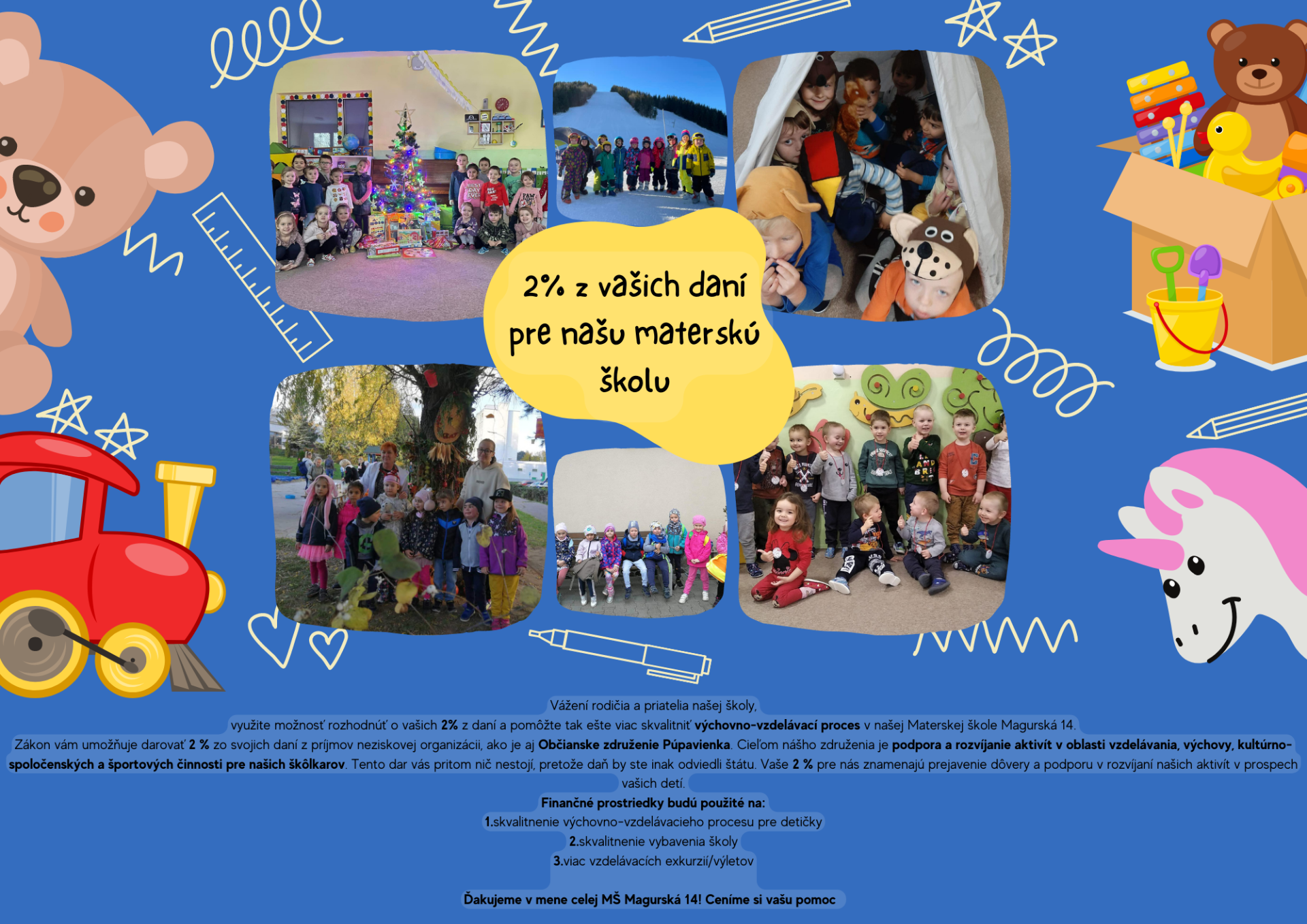 Vďaka vašej ochote a finančnej podpore sa nám doteraz podarilo viditeľne zveľadiť náš školský dvor a tým obohatiť možnosti hier detí na pobyte vonku. Dúfame, že aj tento školský rok sa mnohí z vás rozhodnú podporiť našu materskú školu svojimi 2% dane z príjmu.